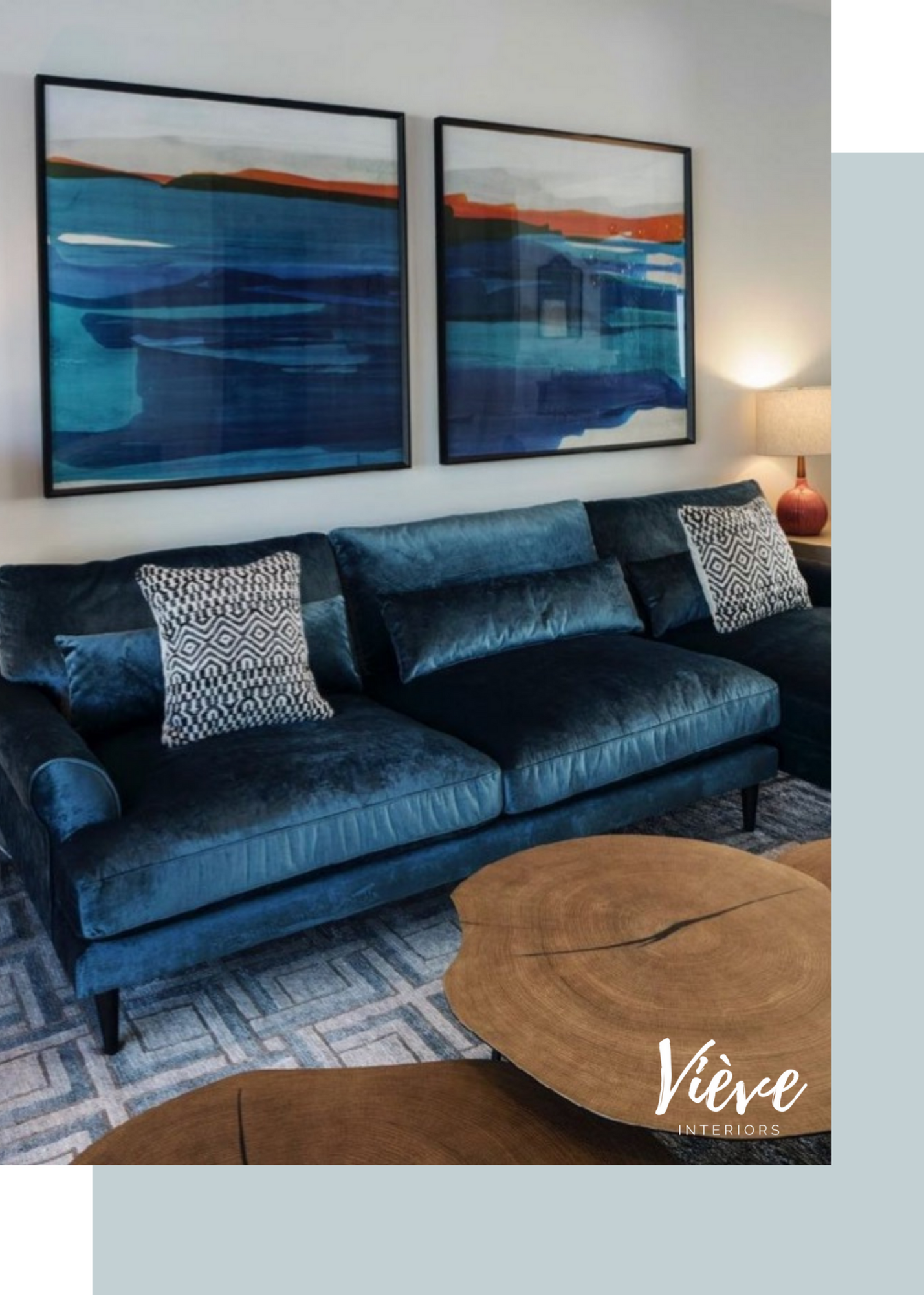 Here we chose to hang very bold artwork and opted for a bold blue velvet sofa to match.
