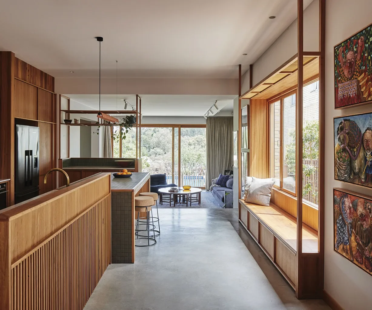 One of the joys of mid-century design is the blur between inside and out. Renovating with this in mind means more than just opening up the back of the house—it’s about material continuity. Think terrazzo that flows from the living room onto the patio, brick that wraps from the fireplace out to the exterior wall, or slatted wood ceilings that stretch across the soffit outside.